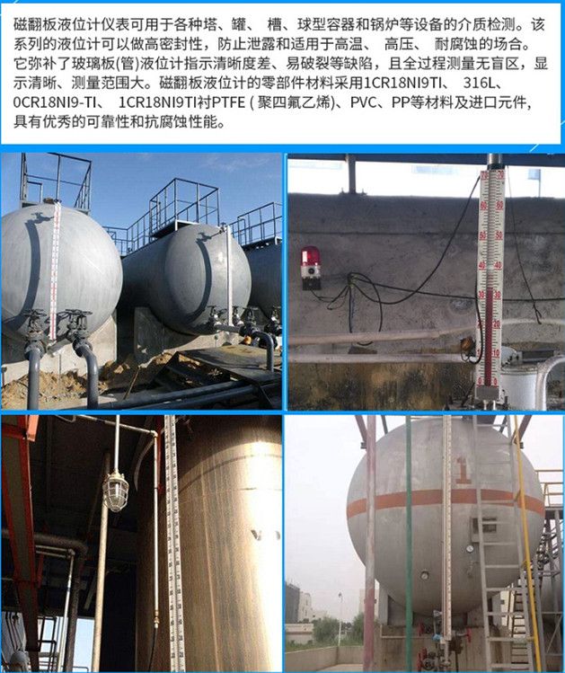 磁翻板液位計廣泛用于石油、化工、油田、醫藥、食品、酒業等行業中各類貯液罐、貯槽、貯液池、反應罐、發酵罐內液體、油田、液化氣、液氫、強酸堿液、弱酸堿液、發電廠鍋爐汽包、高低加、回水箱高低壓加熱器、凝結器、蒸發患有主其他壓力容器內與1Cr8NitTi、304+PTEE(聚四氟乙烯)、316L、PVC、PP相容液體介質的液位、液面及兩種不同介質界面測量與顯示。