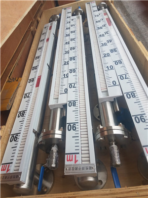 在管體的另一側可按用戶需要加裝電遠傳變送器,將液位高度轉換成標準電流信號輸出,以供液位信號輸出,以供液位信號遠傳至二次儀表進行指示控制與檢測。