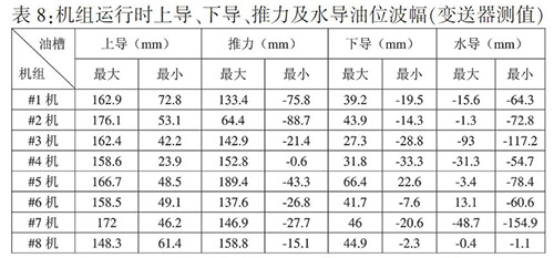 從表8可以看出,上導波幅均在靜態油位以上,容易出現高油位報警;推力和下導油槽油槽波幅均上下跨越靜態油位,容易出現高油位、低油位報警;水導油槽波幅在靜態油位以下,容易出現低油位報警。