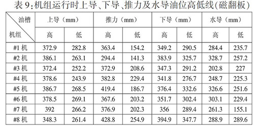 表9中數據可以作為目前油位高低報警的參考線,但是由于目前汛期不具備條件消缺,等到2015~2016年度檢修期間,可以參考該數據和二灘、官地電廠定值對油位高低報警線進行調整,磁開關根據表9進行調整。