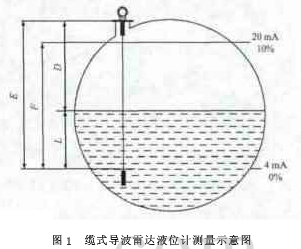 以LD51為例,該液位計是基于TOR(行程時間)原理的“俯視式”測量系統(tǒng)。對參考點至液氨表面間的距離進行測量。高頻脈沖信號被發(fā)射至探頭,并沿探頭傳播。脈沖信號在液氨表面發(fā)生反射,反射信號被儀表接收,并被轉換成物位信息。此測量方法即為TOR法(時域反射法),其測量參考點至液氨表面間距離(D)與脈沖信號的運行時間(t)成比例關系:D=C·t/2,其中,C為光速。如圖1所示。空標高度(E)已知時,液位(L)的計算公式如下:L=E-D。