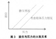 針對設(shè)備的故障,技術(shù)人員采取了更換多種質(zhì)量好的磁感應(yīng)開關(guān)(如耐高溫型等),以及基于磁翻板的外貼式模擬量液位控制,但效果均不理想。其他液位測量(如超聲波等)造價較高,而且需要對設(shè)備進(jìn)行相應(yīng)的改造,并且停運(yùn)一段時間,而該系統(tǒng)屬于公用,上述條件均無法滿足。既要實(shí)現(xiàn)自動控制,又要相應(yīng)允許實(shí)施。技術(shù)人員再次結(jié)合系統(tǒng)圖進(jìn)行了分析:該水位溢流處和下限處范圍還是比較寬裕,而且箱體為非承壓容器,所以箱體內(nèi)的壓力和大氣壓相差不大,即便是有也基本上保持恒定,結(jié)合原水位測量的結(jié)構(gòu),考慮在帶報警開關(guān)磁翻板液位計的液位測量筒下部加裝1臺壓力變送器,在箱體壓力不是很大且基本恒定的情況下,液位與壓力值基本成對應(yīng)關(guān)系(只是在現(xiàn)場修正疊加一個常數(shù)值來消除箱體上不恒壓所帶來的偏差)。液位與壓力的關(guān)系曲線見圖3。
