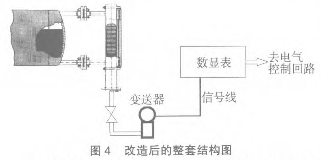 在外配1塊可輸出開關(guān)量接點(diǎn)的模擬量顯示儀表,這樣可實(shí)現(xiàn)液位的自動控制,集體的偏差多少可以在就實(shí)際進(jìn)行整定試驗(yàn)。整套測量系統(tǒng)的結(jié)構(gòu)圖見圖4。