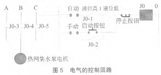 電氣的控制回路見圖5,這樣將數(shù)顯表的接點(diǎn)引入控制回路,可以實(shí)現(xiàn)液位高低的自動控制。同時見圖5集水箱帶報警開關(guān)磁翻板液位計下測點(diǎn)位置與變送器的位置之間可以存一段冷卻后的水,這樣可以保證變送器不會被高溫度的疏水而損壞。