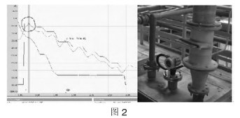 圖5為鈷礦漿化槽液位達到2.3m(量程3m)時回波包絡線圖。該液位計在投產初期一直正常使用,但經過1個月后,液位發生異常波動的情況越來越頻繁,分析回波曲線后,發現在較低的液位(2.3m)時,回波強度也比較弱(30dB)。拆下液位計檢查后發現液位計表面附著了一層黑色的礦漿,導致液位計無法正常工作。