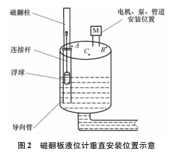 圖 2 中, B 點靠近電機和泵, 蒸餾水液位計安裝在此處既影響電機及泵的檢修, 又因泵附近液位的環流波動較大, 對浮子導向管沖刷嚴重, 故 B 點不合理; C 點處因有管道通過, 不便維護且影響管道和泵、 電機等的起吊更換, 故也不能選擇 C 點; A 點遠離泵和電機, 且有足夠的空間安裝翻板, 便于維護,所以 A 點較為合適。