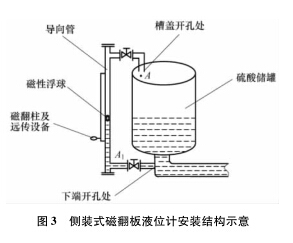 側面安裝方式的關鍵點在于: ①酸槽內壁襯有瓷磚, 故引流管上開孔應選擇槽蓋合適位置, 下孔*好在進口管上, 且均需加閥門, 便于維護; ②考慮管內硫酸在*端天氣時對磁翻柱及測量裝置的影響,因本公司循環槽溫度在75 ℃左右, 為避免夏天溫度過高影響傳感器測量, 冬天防凍, 管徑 D 應在 80mm 以上可保證正常測量。