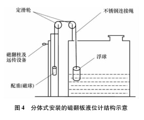 分體式蒸餾水液位計的安裝步驟如下: ①通過計算浮力和配重, 在槽體頂部合適位置安裝定滑輪, 在槽外合適位子安裝磁翻板傳感裝置; ②用直徑為 3 mm 的不銹鋼繩連接浮子和配重, 鋼繩長度根據液位來計算。這里特別要注意, 磁翻板要反向安裝。