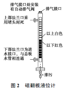 它結(jié)構(gòu)是利用旁通管的原理, 主導(dǎo)管內(nèi)的液位和尾水管內(nèi)的液位高度一致, 根據(jù)阿基米德定理, 磁性浮子在液體中產(chǎn)生的浮力和重力平衡, 當(dāng)尾水管中的水位升降時(shí), 液位計(jì)主導(dǎo)管內(nèi)的浮子也隨之升降, 浮子內(nèi)的永久磁鐵通過(guò)磁耦合驅(qū)動(dòng)指示器內(nèi)的翻板指示器, 當(dāng)液位上升或下降時(shí), 翻板指示器由白色翻轉(zhuǎn)為紅色, 或由原來(lái)的紅色翻轉(zhuǎn)為白色, 指示器的顏色改變的高度就是被測(cè)水位的實(shí)際高度, 從而實(shí)現(xiàn)液位的現(xiàn)場(chǎng)指示, 以供運(yùn)行人員目測(cè)尾水管的實(shí)時(shí)水位。安裝于液位計(jì)管壁外側(cè)的磁記憶開(kāi)關(guān),可多點(diǎn)設(shè)置、滑動(dòng)調(diào)整位置, 提供了液位開(kāi)關(guān)量報(bào)警功能。在裝置的頂部安裝了一個(gè)自動(dòng)排氣裝置, 當(dāng)主導(dǎo)管內(nèi)液位上升時(shí)能夠自動(dòng)的排氣, 下降時(shí)能夠按時(shí)補(bǔ)氣。
