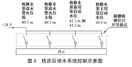 水位點(diǎn)40 .9 m 、41 .1 m 、41 .2 m 的開(kāi)關(guān)量有上升自保持功能;水位點(diǎn)40 .3 m 、40 .5 m 的開(kāi)關(guān)量有下降自保持的功能。技改過(guò)程中保留了壓力變送器的接線, 讓其模擬量繼續(xù)上送上位機(jī), 只作為顯示用, 但在檢修排水系統(tǒng)邏輯中取消壓力變送器控制檢修水泵的啟停功能, 邏輯里增加了由浮子開(kāi)關(guān)來(lái)控制檢修水泵的啟停過(guò)程。