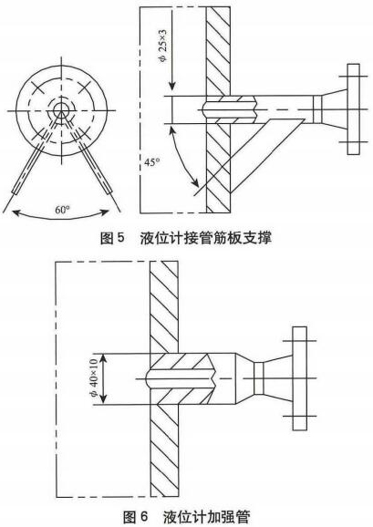 圖5是泄漏酸堿液位計(jì)接管結(jié)構(gòu),雖然必25mmx35mm接管的開孔補(bǔ)強(qiáng)滿足GB150-1989標(biāo)準(zhǔn)[11“開孔不另行補(bǔ)強(qiáng)”的要求,但卻不符合現(xiàn)行標(biāo)準(zhǔn)GB/T150-2011的“開孔不另行補(bǔ)強(qiáng)”要求。因?yàn)?,兩?biāo)準(zhǔn)雖然限制的設(shè)計(jì)壓力(<2.5MPa)與接管外徑(<89mm)等條件相同,但是后者改版標(biāo)準(zhǔn)卻對(duì)接管壁厚及腐蝕裕量增加了要求,這是合理的改進(jìn)完善。對(duì)于本例的425mm接管,滿足GB/T150-2011的“開孔不另行補(bǔ)強(qiáng)”條件的管壁厚度至少應(yīng)為5.5mm(按標(biāo)準(zhǔn)規(guī)定當(dāng)腐蝕裕量為1mm時(shí),接管厚度應(yīng)不小于3.5mm)。所以,按HG/T20583-2011對(duì)小接管避免彎曲而推薦的加強(qiáng)結(jié)構(gòu)優(yōu)先選用加強(qiáng)管形式建議將液位計(jì)接管更改為圖6的加強(qiáng)管結(jié)構(gòu)。這樣不但解決了小接管的開孔補(bǔ)強(qiáng)和防彎曲加強(qiáng)問題,也可以使小接管的設(shè)計(jì)使用年限與罐體一致,而且便于保證小接管與罐體采用插人式全焊透角焊縫的焊接質(zhì)量。