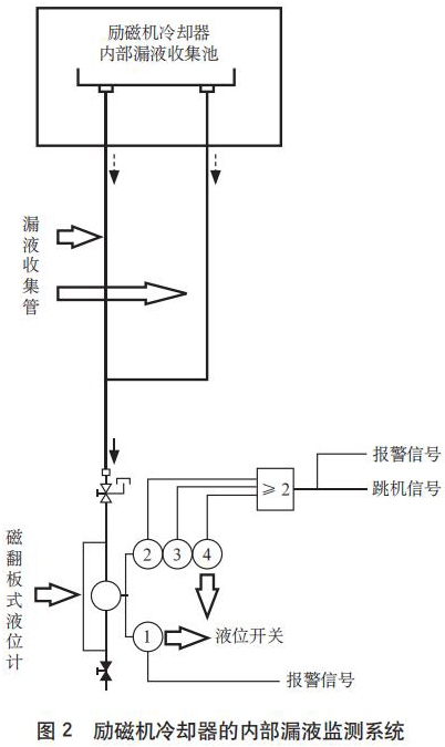 實(shí)際運(yùn)行經(jīng)驗(yàn)表明,球罐液位計(jì)內(nèi)部銅管發(fā)生泄漏的概率較低,但一旦發(fā)生泄漏,漏液會(huì)隨著冷卻空氣沿閉合風(fēng)路進(jìn)入勵(lì)磁機(jī)內(nèi)部,造成勵(lì)磁機(jī)短路損壞的嚴(yán)重后果。為了保證機(jī)組安全,應(yīng)有冷卻器內(nèi)部銅管泄漏監(jiān)測(cè)裝置,然而現(xiàn)場(chǎng)沒(méi)有配置此類裝置。