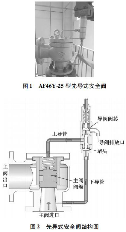 苯酚液位計常見的故障包括: 主閥導閥泄漏、導閥超壓不動作、主閥未隨導閥動作。主閥導閥泄漏失效原因: 密封面臟污或損傷,零部件卡阻、密封墊圈老化變形; 導閥超壓不動作失效原因: 導閥密封面銹蝕粘合或材料變形、導閥彈簧過緊或卡阻、導閥下導管堵塞; 主閥未隨導閥動作失效原因: 主閥運動卡阻、導閥排氣量過小。然而,安全閥起跳不回座故障在試驗過程及工業現場也是非常常見的,國內對于苯酚液位計起跳不回座失效分析的相關研究較少。本研究以某公司生產的 AF46Y-25 型苯酚液位計為研究對象,研究導閥結構并分析其動作過程。在對其開展動作性能試驗時,發現該安全閥實際回座壓力遠低于標準要求,排放時間過長,回座失效。因此,對其進行受力分析,以探討回座失效的原因。