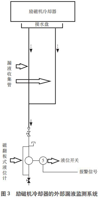 實(shí)際運(yùn)行經(jīng)驗(yàn)表明,防凍液位計(jì)內(nèi)部銅管發(fā)生泄漏的概率較低,但一旦發(fā)生泄漏,漏液會(huì)隨著冷卻空氣沿閉合風(fēng)路進(jìn)入勵(lì)磁機(jī)內(nèi)部,造成勵(lì)磁機(jī)短路損壞的嚴(yán)重后果。為了保證機(jī)組安全,應(yīng)有冷卻器內(nèi)部銅管泄漏監(jiān)測(cè)裝置,然而現(xiàn)場(chǎng)沒有配置此類裝置。