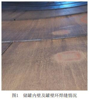 儲罐結(jié)構(gòu)型式為拱頂罐,罐壁的環(huán)焊縫為搭接結(jié)構(gòu),其罐壁的焊縫均沒有進(jìn)行處理,有一定的焊縫余高,罐體內(nèi)直徑隨著高度的增加直徑在變小。儲罐原為原油儲罐,雖然經(jīng)過蒸汽吹掃,罐壁上仍附著油污,罐內(nèi)的防腐層破壞嚴(yán)重。儲罐在制造時,對鋼板的內(nèi)表面要求處理的粗糙度等級不高,使內(nèi)壁殘留許多小的焊瘤、焊渣等,該類殘留物部分有鋒利的銳角。其具體情況如圖1所示。