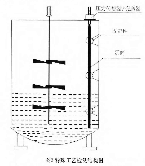 在某些工業材料的制備過程中需要用到攪拌使材料混合均勻,達到工業用料的要求。即使液體始終處于攪拌狀態下,液體表面波動較大,罐體還有明顯的震動,再加上蒸汽、粉塵等比較惡劣的環境,傳統的液位檢測裝置無法正常工作。利用這種沉筒式液位計能很好的解決這一問題,并且能夠通過軟件去除誤差相對較大的數據,保證檢測的精確性,其檢測結構如圖2所示。
