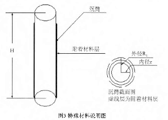 當材料本身有粘附性和凝固性時,沉筒的表明會附著一層或幾層材料,導致其體積發生變化,自身的重量也發生變化,其變化如圖3所示,其中沉筒截面積中虛線層為附著材料層,設此時沉筒外徑為R1。