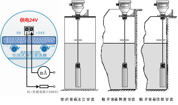 投入式靜壓液位計采用靜液壓測量原理,當測量頭放入液體中時,設大氣壓力為Po,液面到測量元件高為h,液體密度為r,當地重力加速度為g,則變送器探頭上所受壓力為:Pl=Po十r×g×h,敏感元件的負側通過導氣電纜與大氣相通所受壓力為:P2=Po于是測量元件所測到的壓力差值為:P= Pl一P2=r×g×h,對于特定的液體介質和確定的地區,r和g均為常數,于是P口h,即可由儀表輸出電流大小得到液體深度。