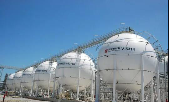 球罐,抗壓性好,與圓筒容器(即一般立式貯罐)相比,在直徑和壓力相同的情況下,罐壁厚度僅為圓筒容器的一半,鋼材用量??;量程大,且占地較小,基礎工程簡單,性價比高,為*常用儲罐之一。