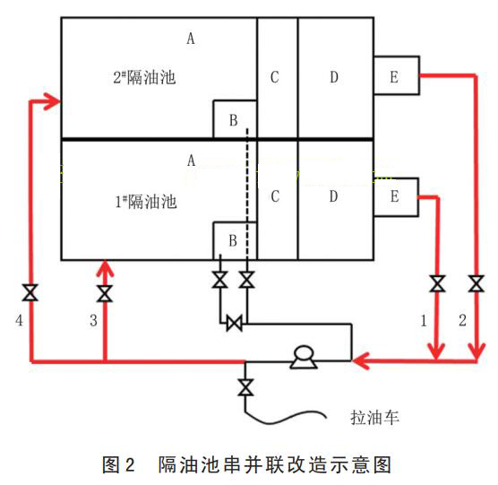為延長含油污水沉降時間,提高分離效果,對隔油池進行流程改造。如圖 2 所示,A 為沉降池,B為 收 油 池 , C 為 集 水 池 , D 為 排 水 池 , E 為 緩 沖池。增加流程 1 至流程 4,含油污水在 1#隔油池沉降分離后,可通過流程 1、3 重新打入 1#隔油池,也可通過流程 1、4 打入 2#隔油池;含油污水在 2#隔油池沉降分離后,可通過流程 2、3 打入 1#隔油池,也可通過流程 2、4 重新打入 2#隔油池。隔油池流程可串聯(lián)或并聯(lián),實現(xiàn)了互聯(lián)互通。正常情況下,含油污水在 1#隔油池沉降分離后,通過流程 1、4 打入 2#隔油池,實現(xiàn) 2 個隔油池串聯(lián)使用。另外,在隔油池出口管線上連接耐腐蝕軟管,并將其固定在龍門架上,實現(xiàn)流程關(guān)斷,有效防止隔油池低液位卸車時油污直接沖進蒸發(fā)池。在蒸發(fā)池增設攔油繩,將污油聚集在有限范圍內(nèi),用臨時泵連接軟管將油污打入隔油池。通過以上措施,充分保證隔油效果,進蒸發(fā)池水質(zhì)清澈無油污。