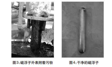 經(jīng)過(guò)兩年多運(yùn)行,污水罐內(nèi)可能沉淀污泥雜質(zhì)導(dǎo)致液位計(jì)示數(shù)不準(zhǔn)。現(xiàn)場(chǎng)拆卸液位計(jì),并且對(duì)浮球和磁浮子進(jìn)行清洗。(圖3-圖4)